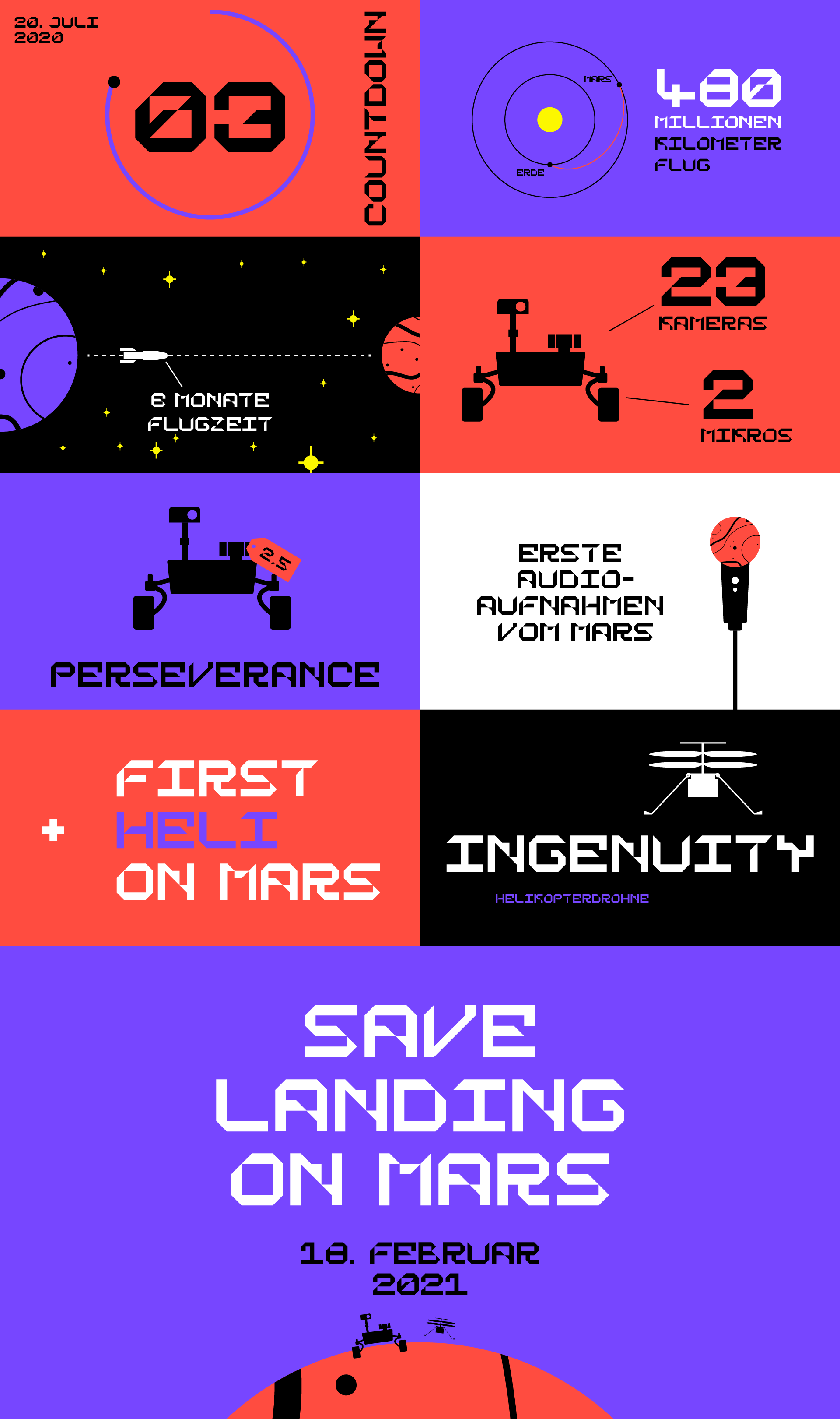 Animation mit den wichtigsten Eckdaten der Marsmission 2020, welche den Rover “Perseverance” und die erste Helikopterdrohne “Ingenuity“ auf den Mars gebracht hat.